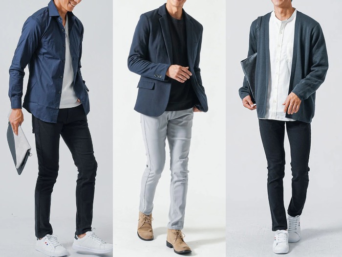 - ボトムス: ダメージジーンズや太すぎるチノパンを、濃紺のキレイめデニムやノータックのスラックスに変える。