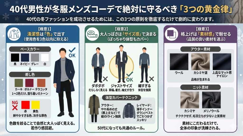 40代の冬ファッションを成功させるためには、この3つの原則を徹底するだけで劇的に変わります。