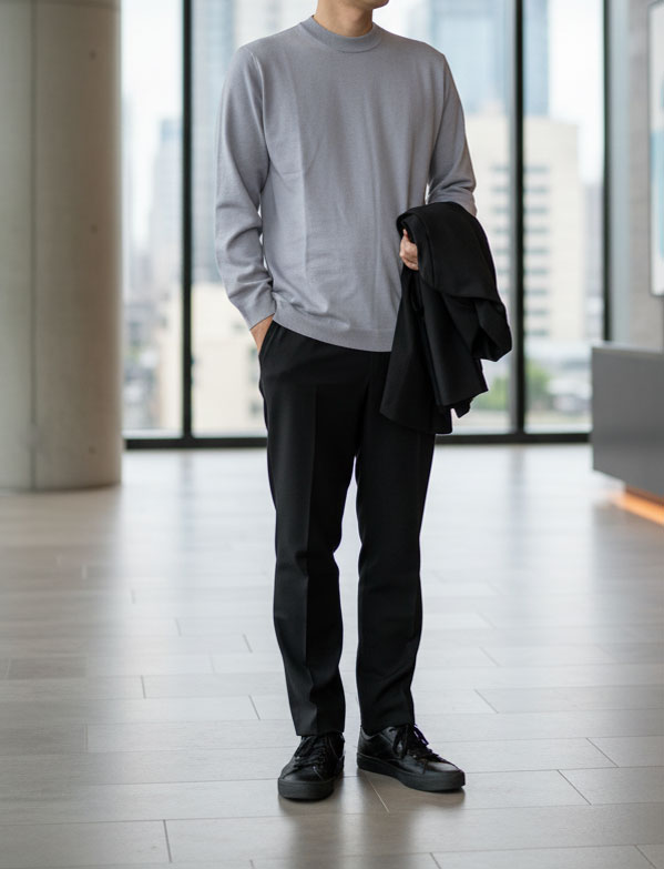 それが「CODEジャケット」と「CODEテーパード」の黒セットアップ、そして「ハイゲージシルクニット」です。