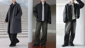 大きめのアウターに細身のパンツを履くときは、ダークカラーで統一するとよりすっきりと見えます。